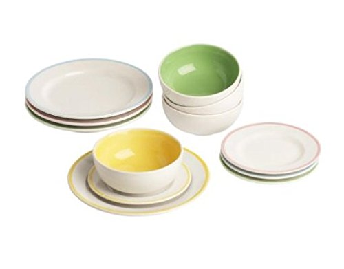ピンク、黄色、水色、緑色、の4色。大きめのお皿、小さめのお皿、スープボウルの合計12ピースセットです。